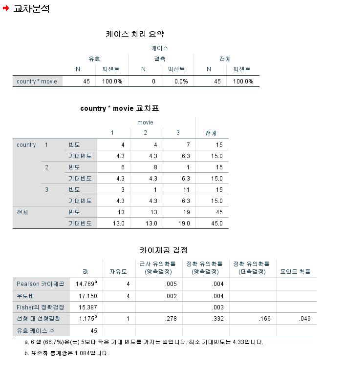 또한, 카이제곱 검정 결과 아래에 66.7%의 셀이 5보다 적인 기대빈도가 있다고 경고합니다.